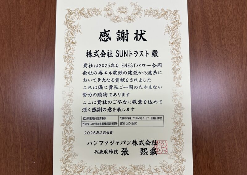 この度、ハンファジャパン株式会社様より2025年の営業実績に対して感謝状をいただきました。